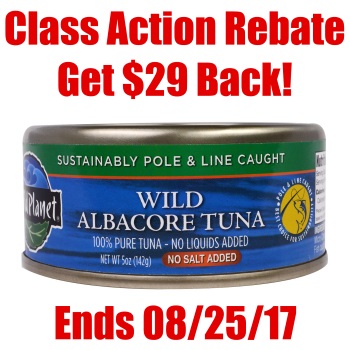 All residents of the United States of America who, from November 5, 2011 to May 12, 2017, purchased any can of branded tuna produced by, for, or on behalf Wild Planet, including cans sold under the “Wild Planet” brand and the “Sustainable Seas” brand are eligible for a cash payment up to $29. The deadline for this settlement is 8/25/17.